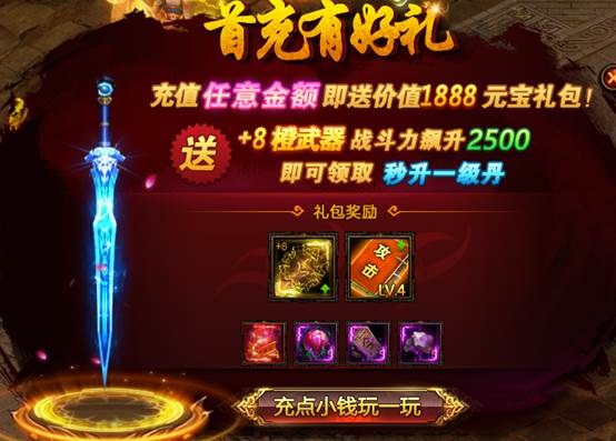 1. 玩家角色达到20级(只需5分钟即可轻松达到),即可免费领取史上超豪华首充礼包;
