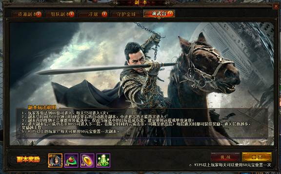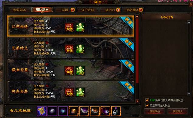 组队副本顾名思义,需要组队才能进入的副本。组队副本的奖励相当丰厚,每天可无限刷;20次内每次通过都可获得声望及经验的奖励。20次后只可获得副本中的掉落;副本中掉落合成准备的必须材料和坐骑装备。
