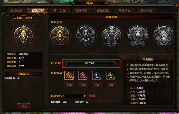 加入帮派后,可以通过完成帮派任务、参加帮派试炼、参加武林大会来增加帮派繁荣度,也可捐献铜钱和指定物品来增加帮派繁荣度,帮派繁荣度达到一定值后,帮派自动升级。增加帮派繁荣度同时也会获得帮派贡献。