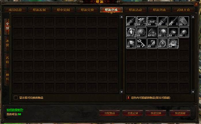 帮派仓库是为帮派成员设定的一个仓库,玩家可把自己不用的非绑定的物品捐献到仓库中,也可在仓库中兑换物品。