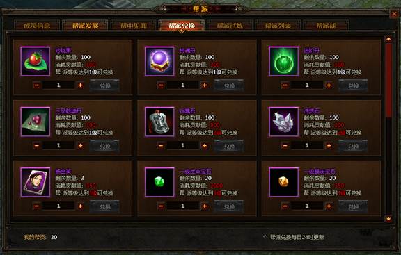 帮派商店内存放着许多游戏中的道具和材料。帮派成员可使用帮派贡献来兑换商店中的物品。
