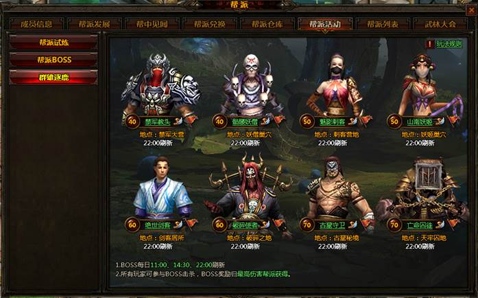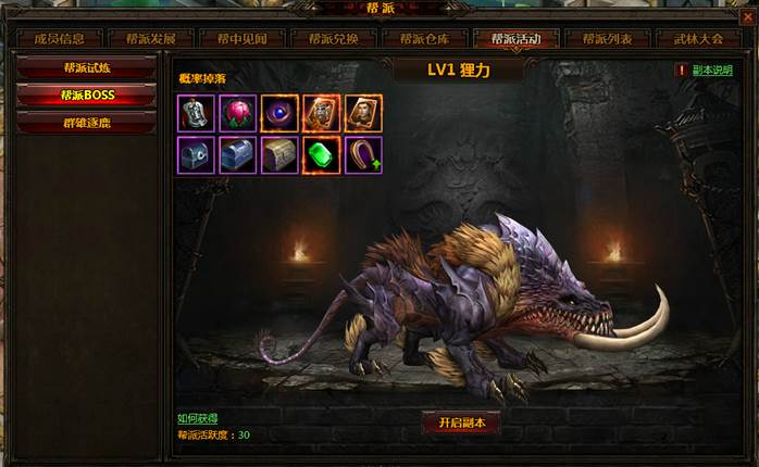 帮派BOSS为帮派的集体副本,需要帮主或者副帮主开启,开启需要消耗1800点帮派活跃度;帮派活跃度在完成每天帮派任务、帮派试炼中获得。