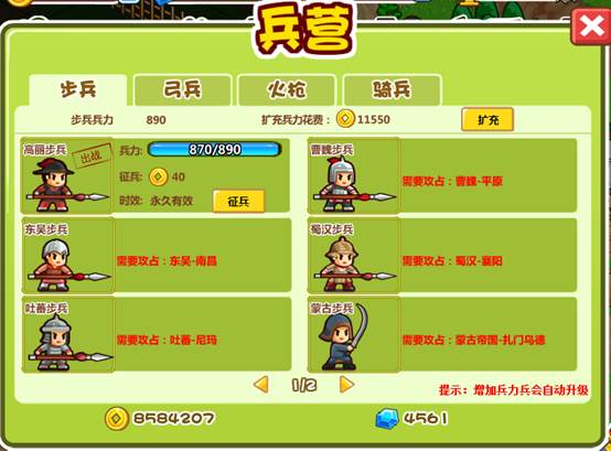 2.6 兵力:在兵营,花费金币可扩充。扩充兵力是按照兵的类型扩充。