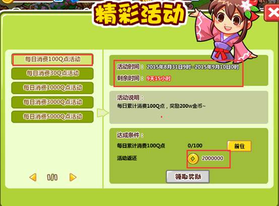 2、 精彩活动中,主要发布一些消费、充值相关的优惠活动,满足条件将获得相应奖励。