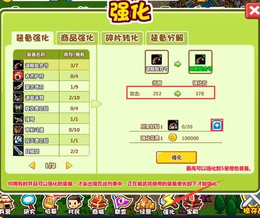 c)只有有库存的装备才能进行强化(注意,在任意阵容中,装备中的装备不会显示在库存中)