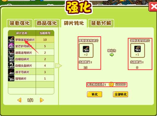 4、 碎片转化可将不需要的碎片转化成指定的碎片,提高碎片的利用率;