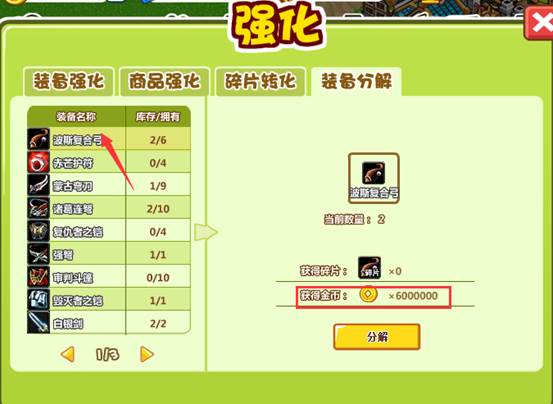 5、 不需要的装备可进行分解,分解后装备数量减少,并获得相应的金币。