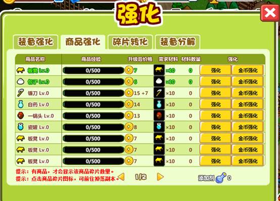 2、 强化分为装备强化、商品强化、碎片转化、装备分解4个标签。