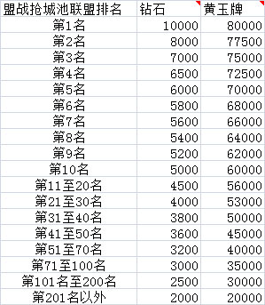 ·所有参与联盟,根据排名,联盟内前20名成员,获得钻石和黄玉牌奖励(后续版本增加消耗黄玉牌的联盟商店)