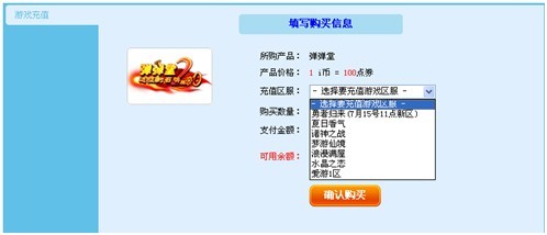 1.登陆账号充值页面,“弹弹堂”选择您需要充值游戏角色的区服。原“爱游1区”与“浪漫满屋”区服仍旧存在。请玩家选择原角色所在区服进行充值。