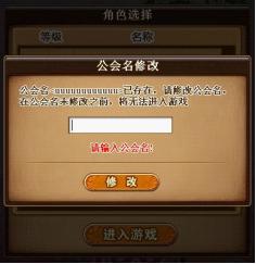 A:如果玩家是公会会长且存在相同的公会名则需要重新输入新的公会名称点击进入按钮即可进入游戏。(若公会有重名,则后注册的公会名被强制改名,改名规则为在公会名后加上“&1”符号。有二个重名则为“&2”,以此类推)