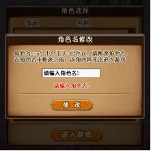 玩家选择重名角色后点击进入按钮则弹出修改呢称的对话框,重新输入新的呢称后点击进入按钮即可进入游戏(角色名修改规则同角色新建时的角色名输入规则)。