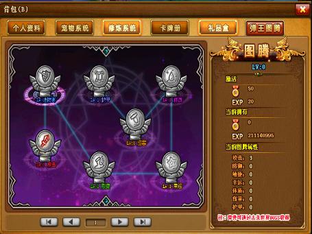 弹王图腾是为弹友能快速增加属性而推出的系统,角色等级达到20级的弹友即可体验,点亮弹王图腾中的图腾即可获得相应的属性,攻击、防御、敏捷、幸运、伤害、护甲、血量都不在话下,而点亮图腾只要消耗经验和荣誉值(荣誉值终于派上用场了),增加属性,加强战斗力就是变得如此简单,元芳,此事你怎么看?