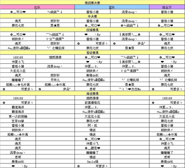 2、 每天的比赛结果将在第二天下午16:00前在官网公布,活动奖励在全服活动结束后3~5个工作日内统一发放。届时将发放实际出战者的奖励(如决赛、4强对决阶段,参赛一方的情侣未能出战,则不获得奖励。如比赛过程中掉线,则可获得对应名次的奖励。)