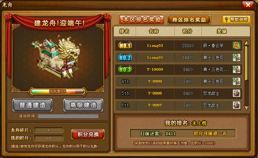 本次的龙舟活动将送出全新稀有装备,根据大家对龙舟建造的贡献,本区以及跨区积分排名在前10位的玩家,将获得全新高属性神器、项链、首饰、套装等奖励。