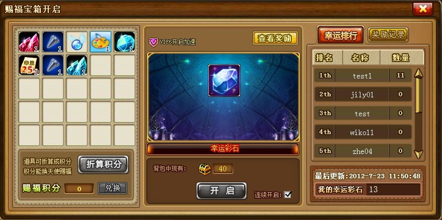 前十名的奖励获得需要幸运彩石的数量不能低于70个。活动结束后系统将弹出“幸运彩石奖励兑换“列表,弹友可查看前十排名和奖励物品。。奖励在活动结束后将通过邮件发送给各弹友(奖励物品均为绑定),活动期间所获得幸运彩石也将回收;前十名所获得的神器和戒指,有效期为23天,且不能在铁匠铺进行操作及续费,过期即消失。