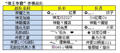 请“弹王争霸”入围的战队仔细查阅自己所在的对战场次,请队长提早并及时通知各个队员进入赛场。此次活动主场IS3频道。届时由我们的美女MC为大家主持此次盛大的争霸赛。现邀请各大公会及成员一起狂欢弹弹堂,一起进入弹弹争霸赛的火爆盛况中来。