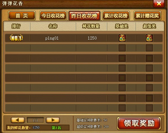 今日收花榜。点击今日收花榜可实时查看今日的收花情况以及可以获得的奖励。