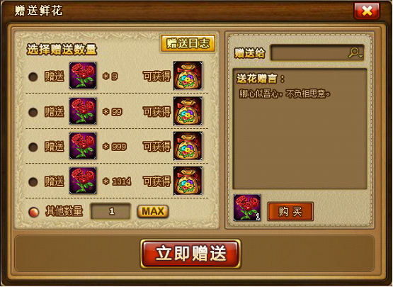 点击“赠送鲜花”按钮进入赠送界面。在赠送界面,可赠送鲜花给指定玩家,一次性赠送特定数量可领取奖励,还可以查看赠花收花日志哦。如赠送999朵以上,送花赠言会在世界频道显示,并且飘下漫天花雨。