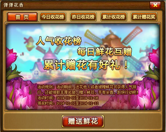 赠人鲜花,手有余香。在活动期间,送人鲜花或者被赠鲜花可获得人气排行,还有丰厚奖励可以领取哦!