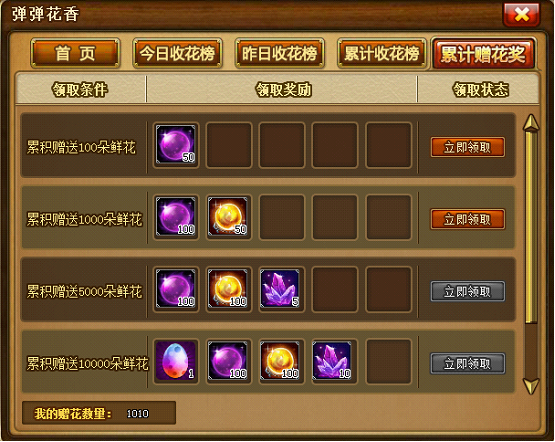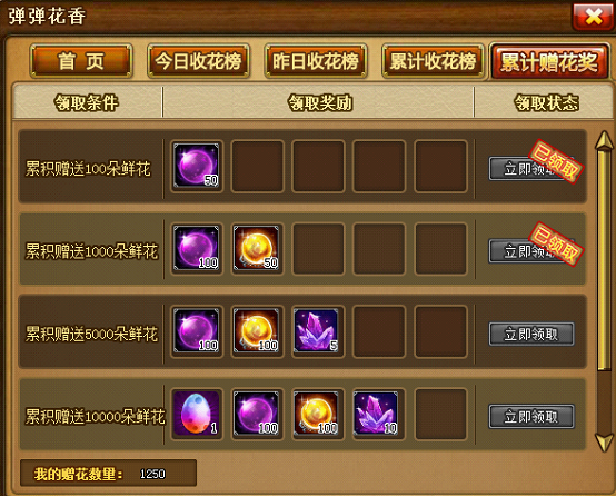 累计赠花奖。赠送他人鲜花达到一定数量,可以领取累计赠花奖,每个阶梯的奖励只能领取一次。