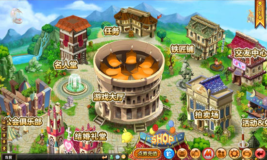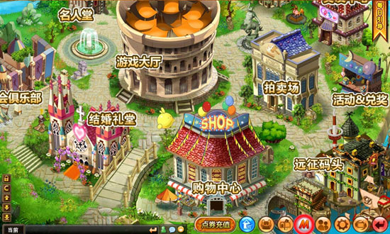 进入到游戏后,首先会进入到游戏主界面。主界面中的各种建筑具有不同的功能: