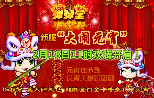 欢度新春,共庆元宵佳节!吃元宵、赏花灯、舞龙、舞狮子。弹弹王国元宵精彩纷呈!火爆新服“大闹元宵”2月18日11时欢腾开启!新春新挑战,新同伴,新战役,畅享节日气氛,一起来弹弹新服大闹元宵佳节!更有我为美丽狂—弹弹MM娱乐社团激情加入!与可爱MM们一起欢度元宵,一起扔弹弹吧!