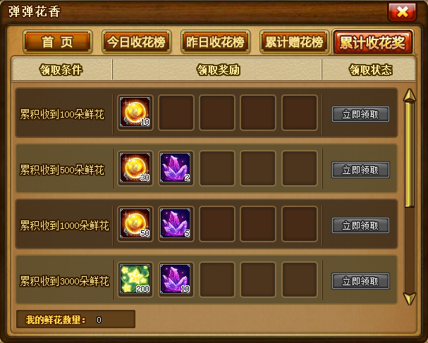 累计收花奖。收到鲜花达到一定数量,可以领取累计收花奖,每个阶梯的奖励只能领取一次。