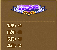 能量之源:激活潜能攻击+80、防御+80、敏捷+80、幸运+80,有效期7天。