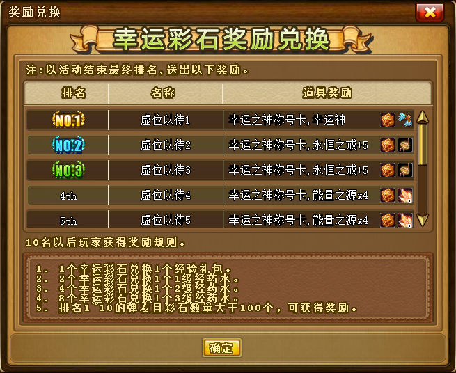 前十名的奖励获得需要幸运彩石的数量不能低于100个。活动结束后系统将弹出“幸运彩石奖励兑换“列表,弹友可查看前十排名和奖励物品。奖励在活动结束后将通过邮件发送给各弹友(奖励物品均为绑定),活动期间所获得幸运彩石也将回收;前十名所获得的神器和戒指,有效期为23天,且不能在铁匠铺进行操作及续费,过期即消失。
