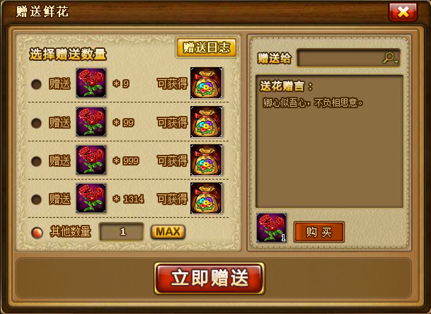 点击“赠送鲜花”按钮进入赠送界面。在赠送界面,可赠送鲜花给指定玩家,一次性赠送特定数量可领取奖励,还可以查看赠花收花日志哦。如赠送999朵以上,送花赠言会在世界频道显示,并且飘下漫天花雨。