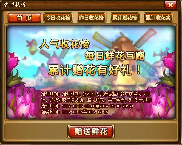 赠人鲜花,手有余香。在活动期间,送人鲜花或者被赠鲜花可获得人气排行,还有丰厚奖励可以领取哦!