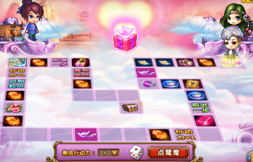 2、 活动通过点鸳鸯来触发行走,并遇到各类事件,点鸳鸯需要消耗1点行动力,行走过程中可能遇到喜鹊或者各类道具奖励。