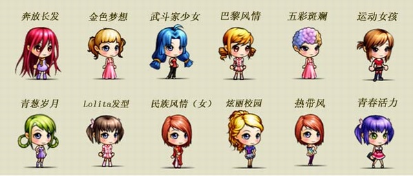 女头发(8款):奔放长发、金色梦想、武斗家少女、巴黎风情、五彩斑斓、运动女孩、青葱岁月、Lolita发型