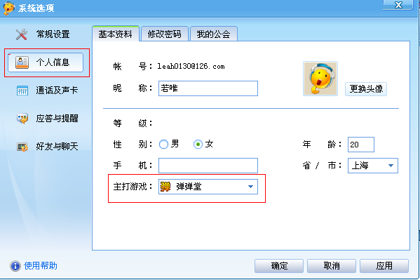 进入以下“系统选项”面板,点击“个人信息”,将主打游戏转换成弹弹堂即可!