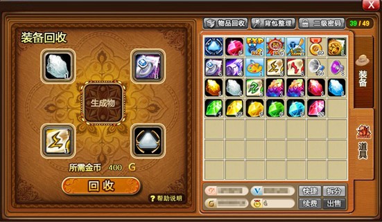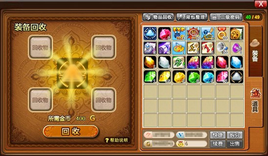 从背包打开回收界面,我们挑选4件多余或没用的物品,拖放到左侧回收物栏,点击下边的“回收”按钮,一件新的物品即出现在中间的生成位置。