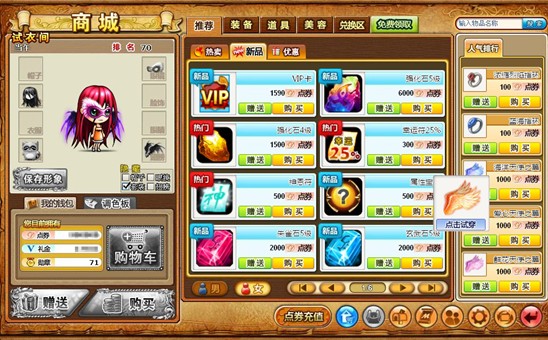 最后,我们来了解一下商城的变化。『新纪元』中,商城界面焕然一新:物品按用途重新分类,大家能更便捷地按需选购;同时,右侧增加了人气排行,时下流行商品一目了然。心细的弹友可能已经发现了,主标签新增了一项“免费领取”。对!每天系统都会在这里提供一批物品,供大家免费抢领。比如:今天系统提供10种商品,每种商品100件,弹友不论等级、不分穷富,上线就能免费挑选一件心仪的商品。此外,购物流程也有大幅改进,弹友们不用再反反复复地切换试穿、购物车,试穿与购买都能一键搞定……