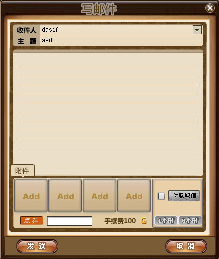 附件:点击附件下面的“Add”小框可以添加邮件附件,可用于赠送及游戏内交易。