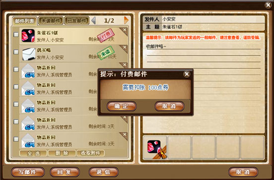 付费:带有“付费”字样的邮件是付费邮件,收取付费邮件中的附件需要付出相应的点券。