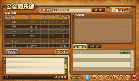 公会列表:显示已经建立的公会,并显示公会资料,包括公会名、会长名、公会人数、公会等级、公会功勋。