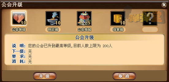 升级:点击升级按钮可以消耗公会财富和金币对当前界面的公会等级/设施进行升级。