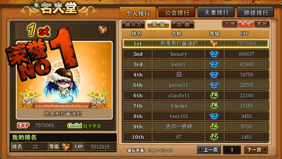日增:点击查看当日增加经验/功勋的个人排行榜。