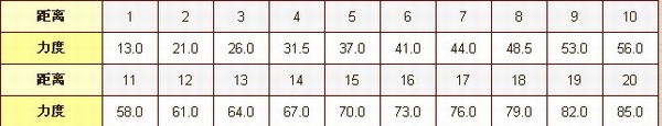 在面对对手的情况下,使用“↑ ↓”键将角度盘中显示的角度调整到65,测量自己与对手的距离。测距完毕之后参照下列公式进行发射炮弹的力度调整,下面65度不同距离使用的力度: