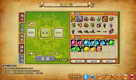 | 强化系统 | 合成系统 | 熔炼系统 | 镶嵌系统 | 随身铁匠铺 | 快捷购买功能 |