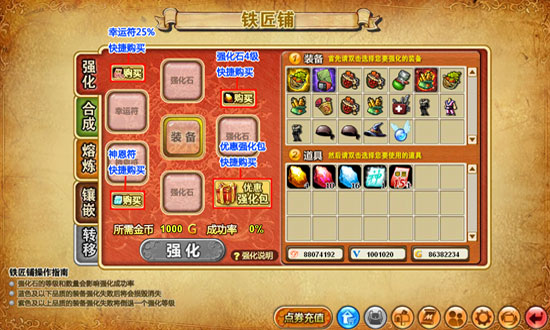 在铁匠铺中可以进行各种快捷购买,包括幸运符25%、神恩符、强化石4级等,不用经历先购买强化物品再进入铁匠铺进行强化的繁琐步奏了。