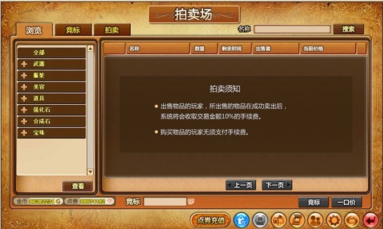 在拍卖场成功出售物品后,通过邮件发送回拍卖人信箱的点券将自动扣除拍卖成交价格10%的手续费。