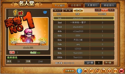 游戏中的名人堂有各种排行,个人排行是其中的一大类。个人排行是针对个人数据的一些排行,其中包括等级、功勋、战斗力3个排行。