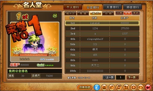 游戏中的名人堂有各种排行,公会排行是其中的一大类。公会排行是针对公会数据的一些排行,其中包括等级、资产、功勋、战斗力4个排行。