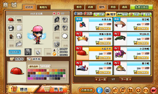 在游戏中的服饰分为套装、眼镜、帽子、衣服、饰品,帽子可以在商城购买。购买的步奏为:进入商城→点击服饰→点击帽子→选择购买帽子。