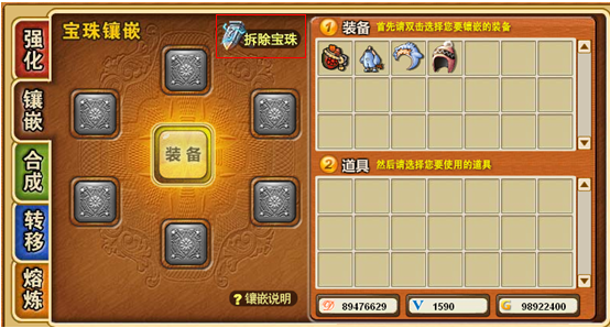 下面来看一下朋友给出的第二张图,这是一张铁匠铺镶嵌宝珠页面的图。与老界面相比好像是多了一个拆除宝珠的功能。虽然我朋友没有介绍这个功能怎么用,但是以我这种玩骨灰级玩家来说,随便看下就知道是咋回事了。